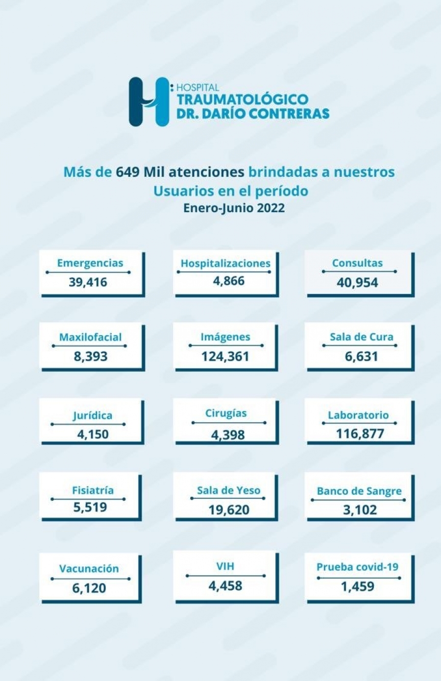 El Hospital Traumatológico Doctor Darío Contreras, desde el mes de enero hasta junio del 2022, ha ofrecido más de 649 mil 619 servicios a favor de los usuarios en las diferentes áreas que son atendidos.